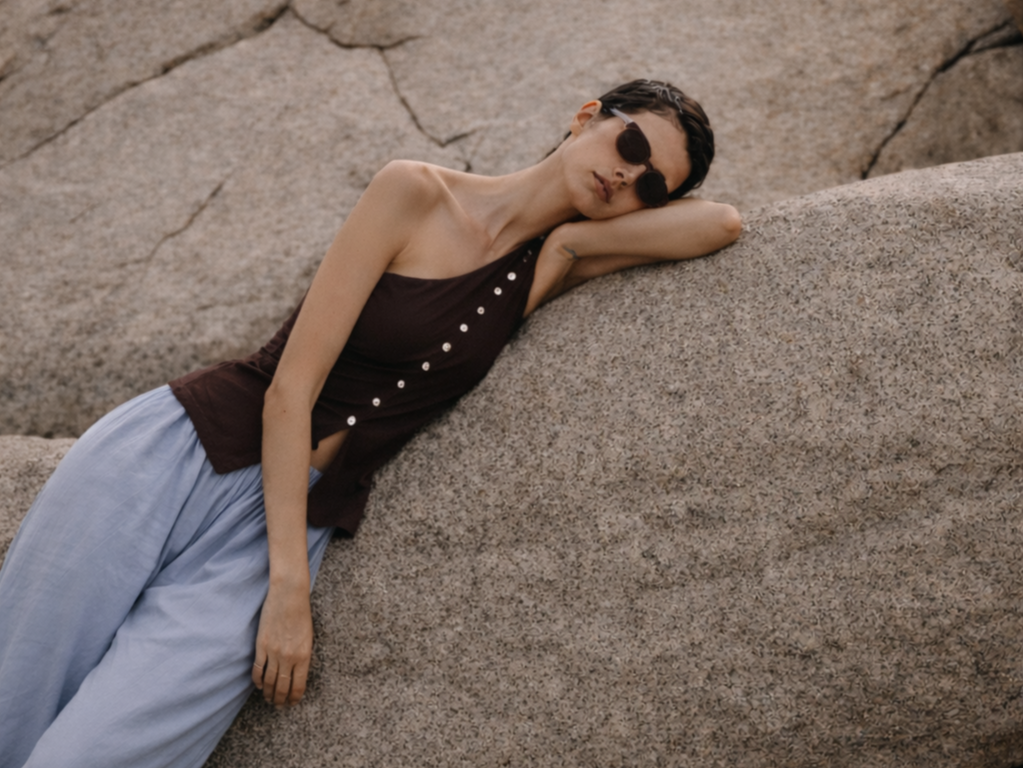 A playful, handcrafted statement piece, the Carapace Crochet Top features delicate shell details covering the chest for a fun and daring twist. Lightweight and airy, this top pairs effortlessly with the elegant Cassandra Pants for a balanced, modern look. Perfect for making a bold, fashion-forward statement.